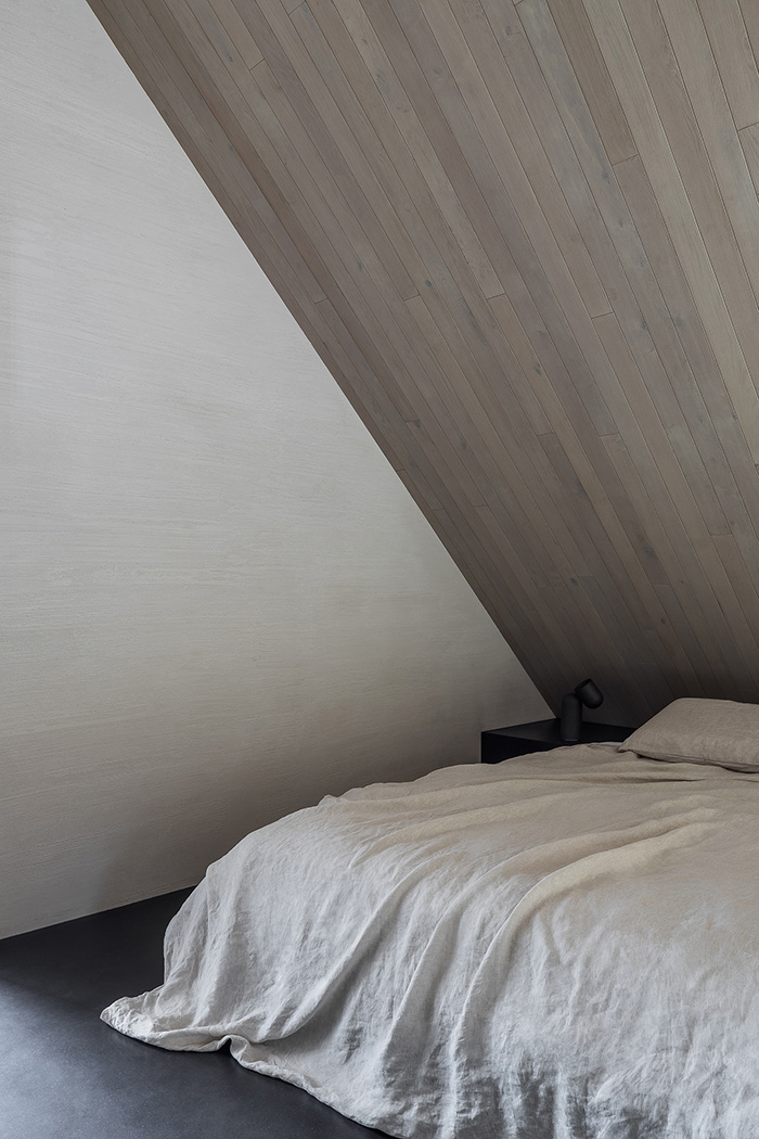 The V-shaped ceiling is lined in oak wood and has a strong presence in the space.